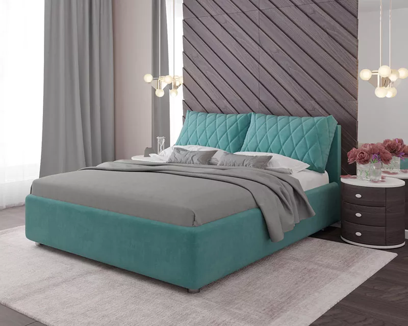 Современная интерьерная кровать с оригинальным мягким изголовьем, декорированным двумя объемными съёмными подушками.